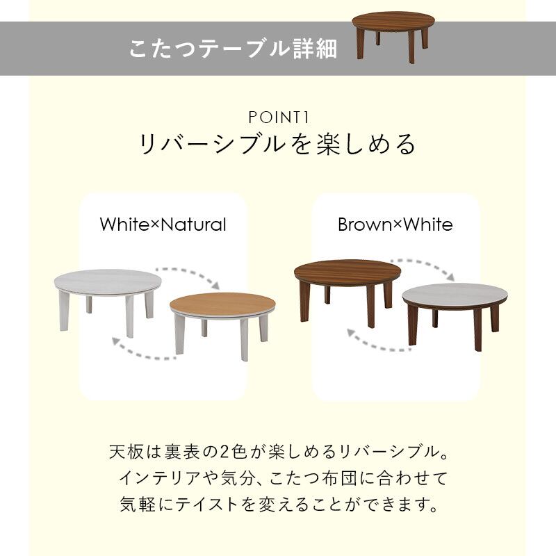 天板がリバーシブルでオールシーズン活躍するカジュアルコタツ。軽くてかさばらない布団セット