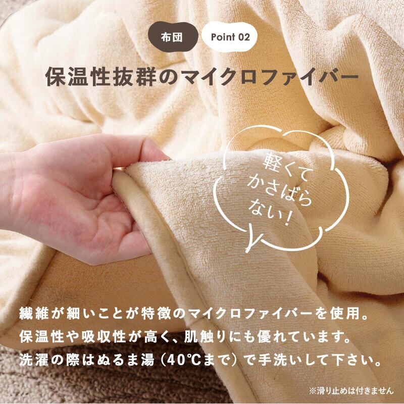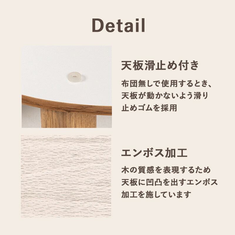 素材 こたつ:<ナチュラル>プリント紙化粧繊維板<グレイッシュホワイト>合成樹脂化粧繊維板(塩化ビニル)、うす掛け:<表地・裏地>ポリエステル(マイクロファイバー)<中綿>ポリエステル