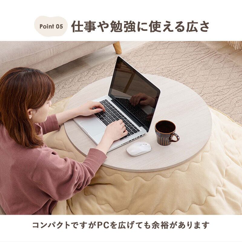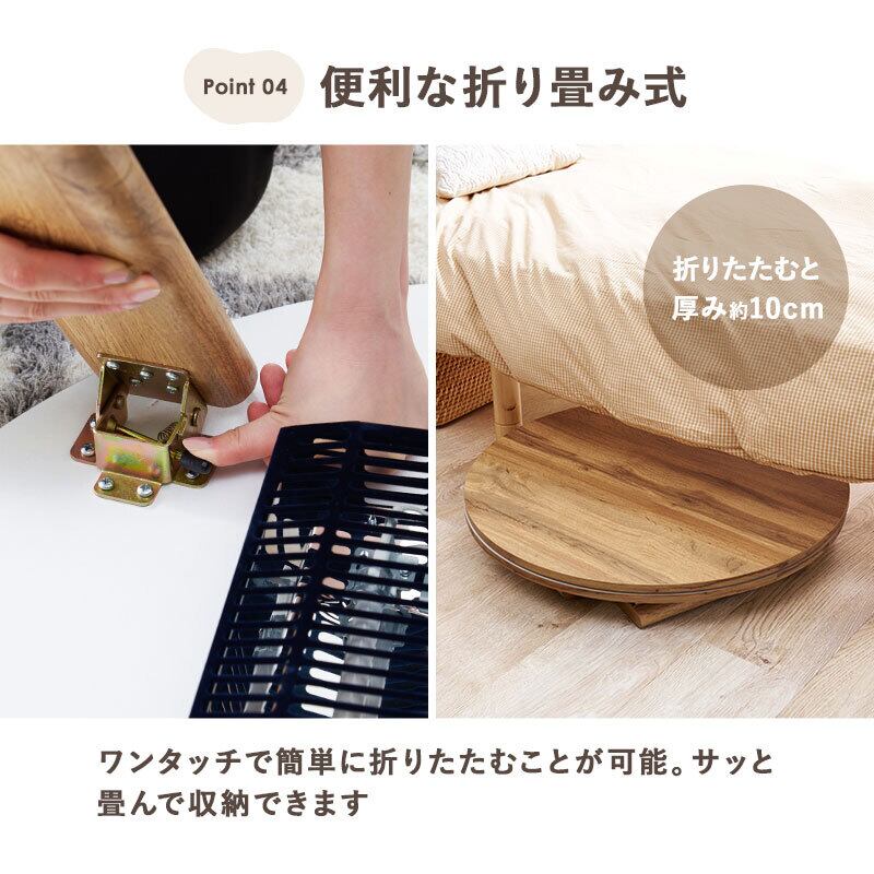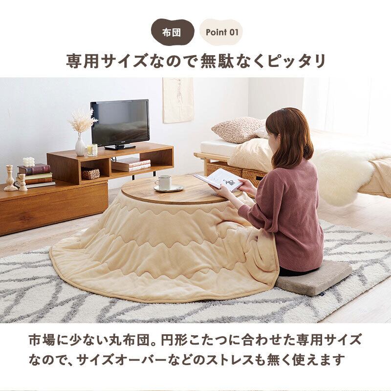 狭い部屋にも置きやすいコンパクトな円形コタツ。脚は折りたたんで隙間に収納も可能。軽くてかさばらない掛け布団セット