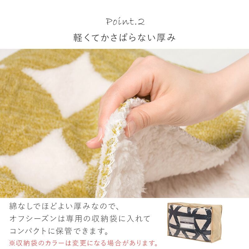 ふんわりとした北欧柄のボア生地が身体をやさしく包み込む、うす掛けこたつ布団です。軽量でかさばらない中綿なしタイプなので、収納や取り扱いも簡単。さらに洗濯可能で、清潔に長くお使いいただけます。