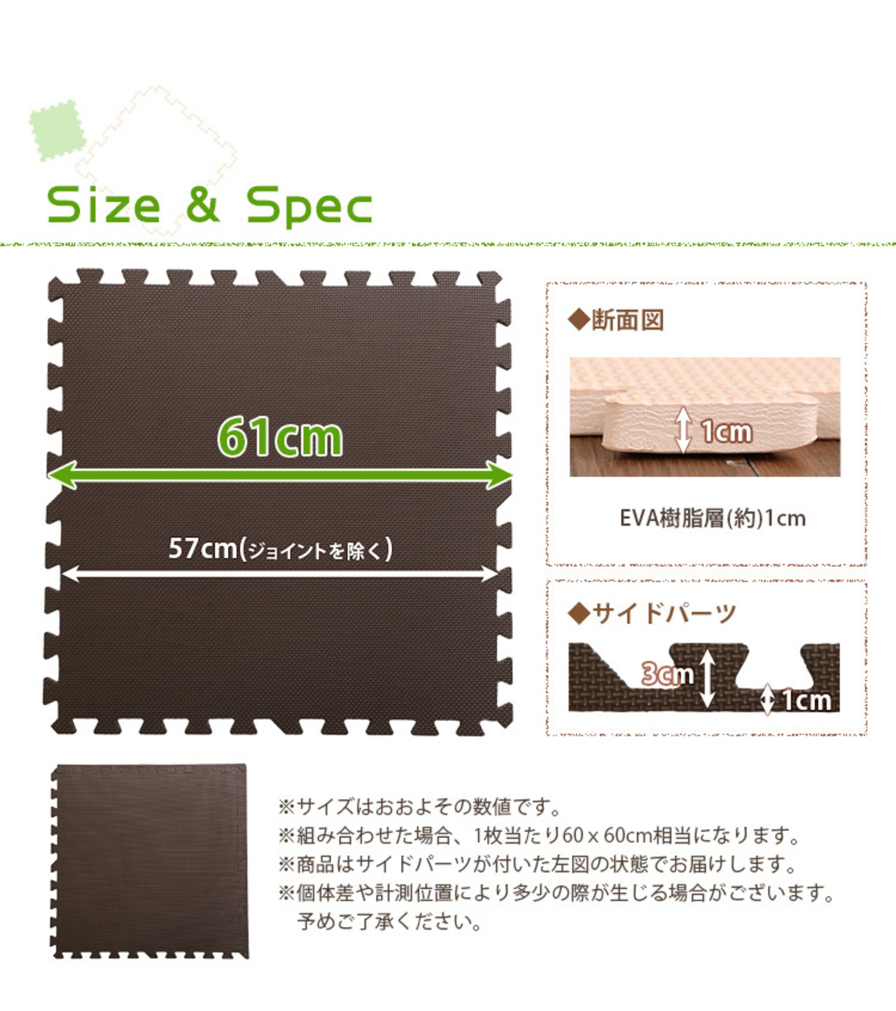 外寸(1枚当たり):(約)幅61cmx奥行き61cmx厚み1cmサイドパーツ付属時:(約)幅62cmx奥行き62cmx厚み1cm(約)3.9kg