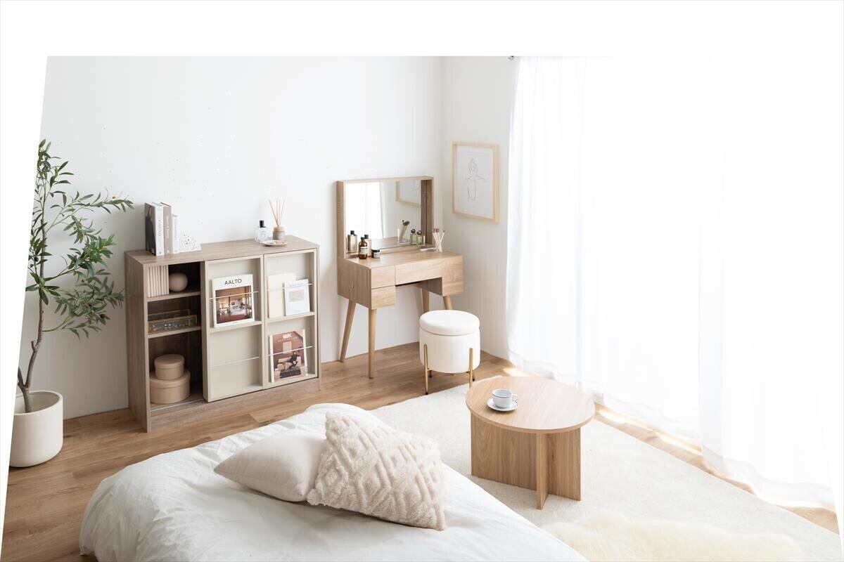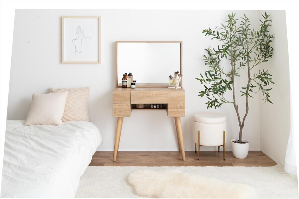 大きな鏡と広い作業スペースでのびのびメイクが叶う『Emu(エミュ)』ドレッサーデスク。大きな鏡と大容量の収納スペースは、ヘアセットやメイクアップを効率よく進めることができ、毎日の忙しい朝にもピッタリ。毎日のお出かけ準備を快適にするため、使いやすさをとことん追求しました。ドレッサー空間を自分だけのお気に入りの場所に変え、心安らぐメイク時間をお楽しみください。