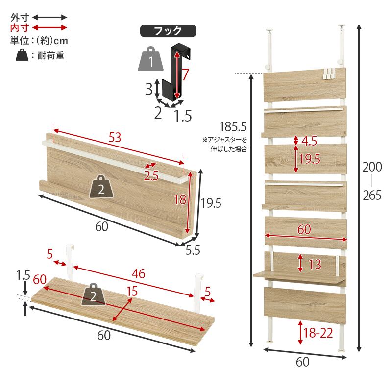 サイズ (約)幅60×奥行21.5×高さ200~265cm