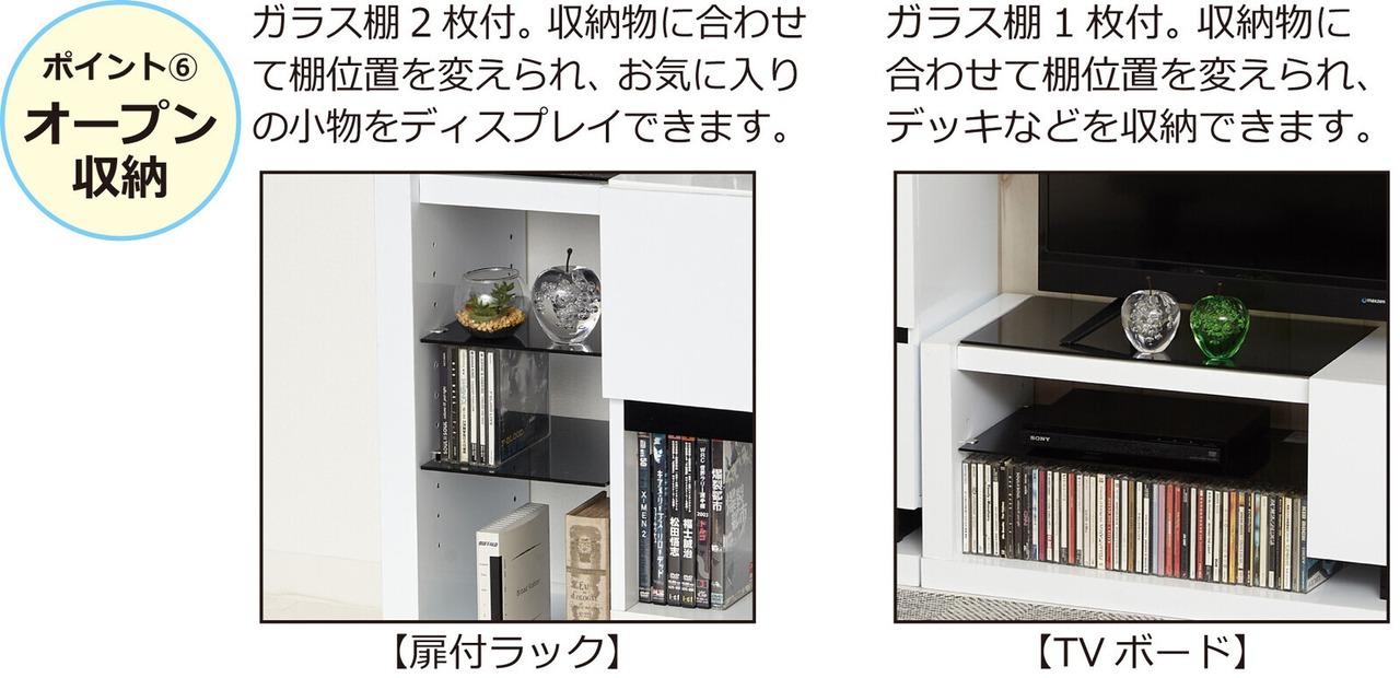 ●ガラス棚2枚付。収納物に合わせて棚位置を変えられお気に入りの小物をディスプレイ。