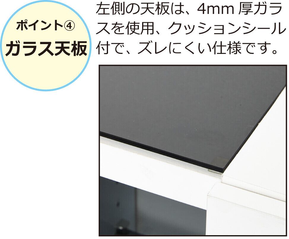 ●左側の天板は4mm厚のガラスを使用、クッションシール付でズレ難い。