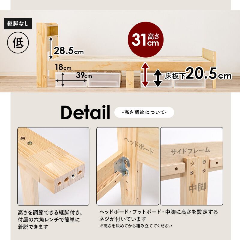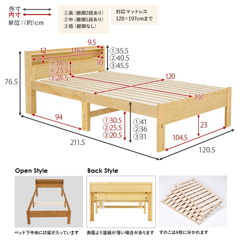 サイズ ベッド:(約)幅120.5×奥行211.5×高さ76.5×床面高31/36/41cm、マットレス:(約)幅120×奥行195×高さ19cm