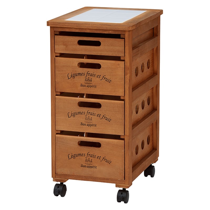 木製のストッカー「MUD-6604」は、野菜の保存に最適なアイテムです。通気性が良く、野菜がサクサクとした状態で長持ちします。さらに、キャスターが付いているので、移動や掃除もラクラクです。タイル天板は熱い鍋などを置くのにも便利で、使い勝手抜群です。