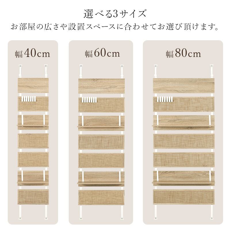 ナチュラルのラタン調ボードがおしゃれなアクセントに。お部屋のいろいろな場所に設置できる突っ張り式ラック。