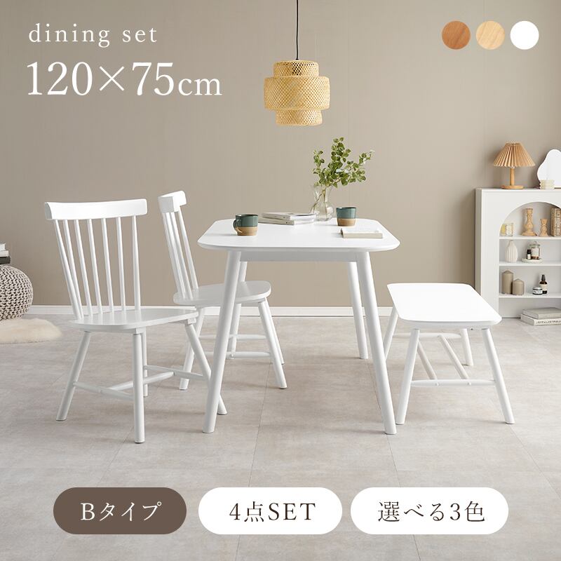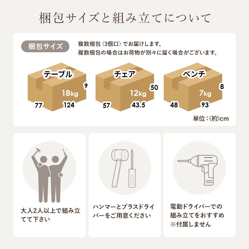 サイズ テーブル:(約)幅120×奥行75×高さ70cm、チェア:(約)幅50×奥行55×高さ85×座面高42cm、ベンチ:(約)幅91×奥行44×高さ40cm