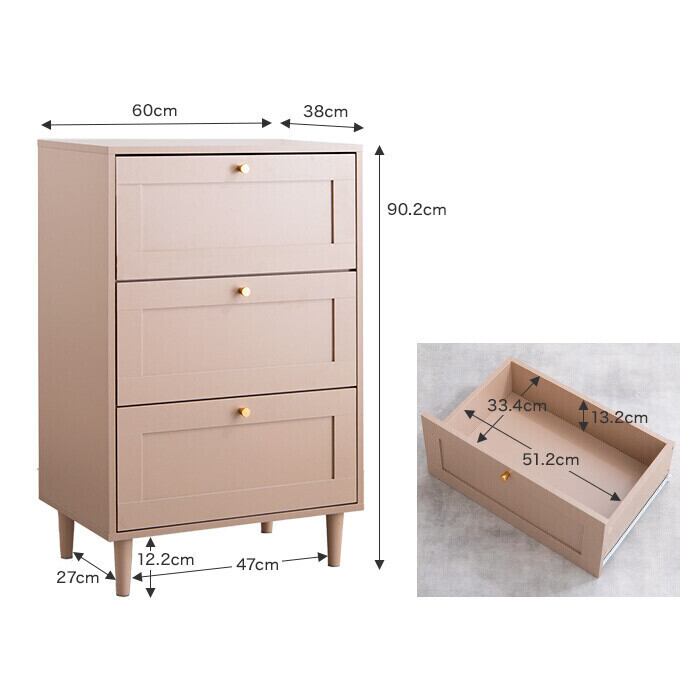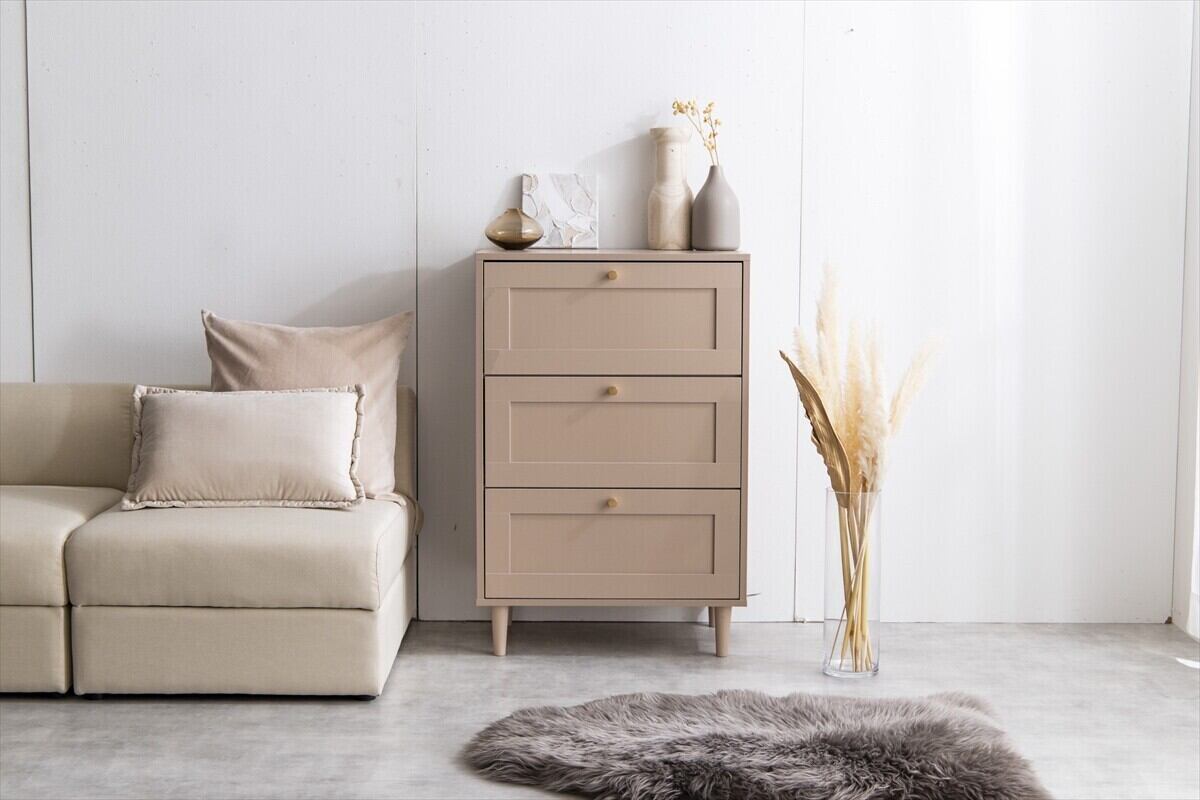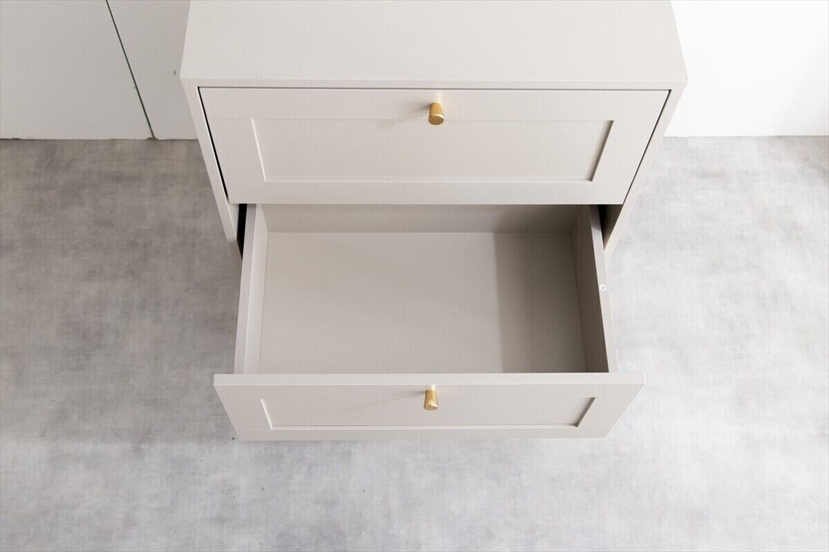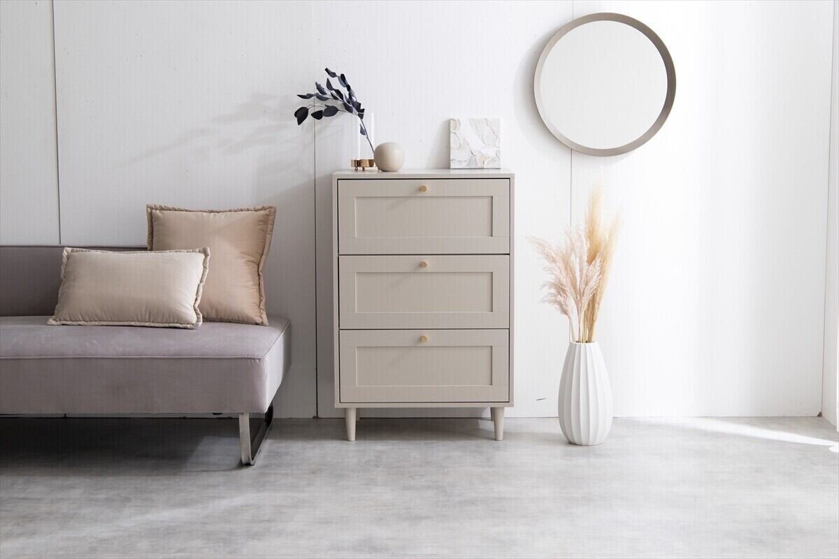品のある框(かまち)デザインと柔らかなニュアンスカラーが印象的な『Calan(カラン)』シリーズのチェスト。シャンパンゴールドの取っ手と美しい框デザインはお部屋のアクセントとなり、感度の高い海外インテリアのような空間へと導きます。また、柔らかなニュアンスカラーで甘すぎない大人な可愛さもプラス。置くだけでお部屋をセンスアップさせます。さらに、サイズは一人暮らしやワンルームの方でも置きやすいコンパクト設計。圧迫感を抑えて置けるのでお部屋がすっきり見えます。また、コンパクトなのに収納力も抜群。引き出しの深さもしっかりあるので、厚手の物や高さのある物もしっかり収納できます。オールシーズンの衣類をまとめて収納しておきたい方にもオススメです。