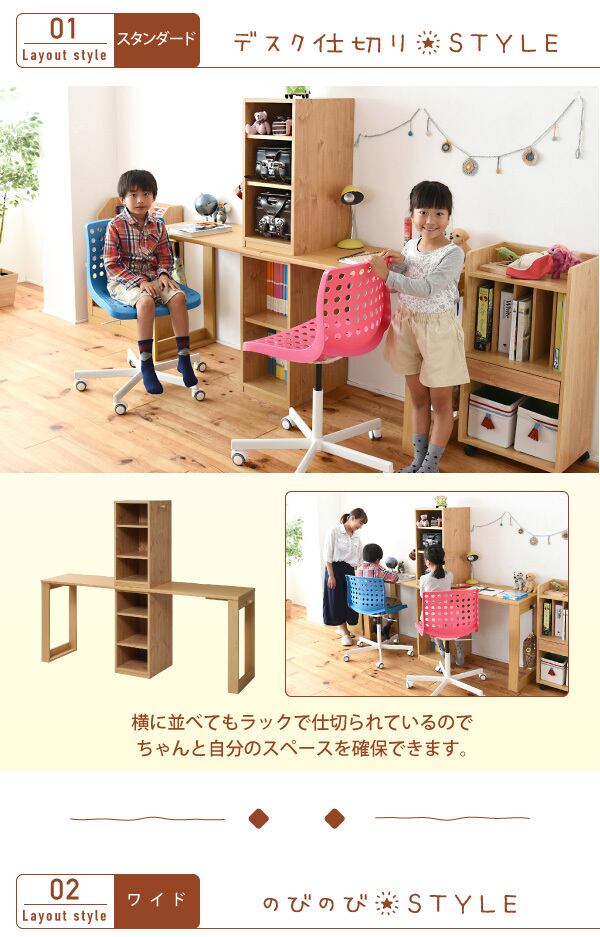 兄弟・親子で並んで使えるコンパクトでシンプルなツインデスク。ラックの位置が変えられ、お部屋に合わせて2つのデスクをくっつなけたり離したりと様々なコーディネートが楽しめます。