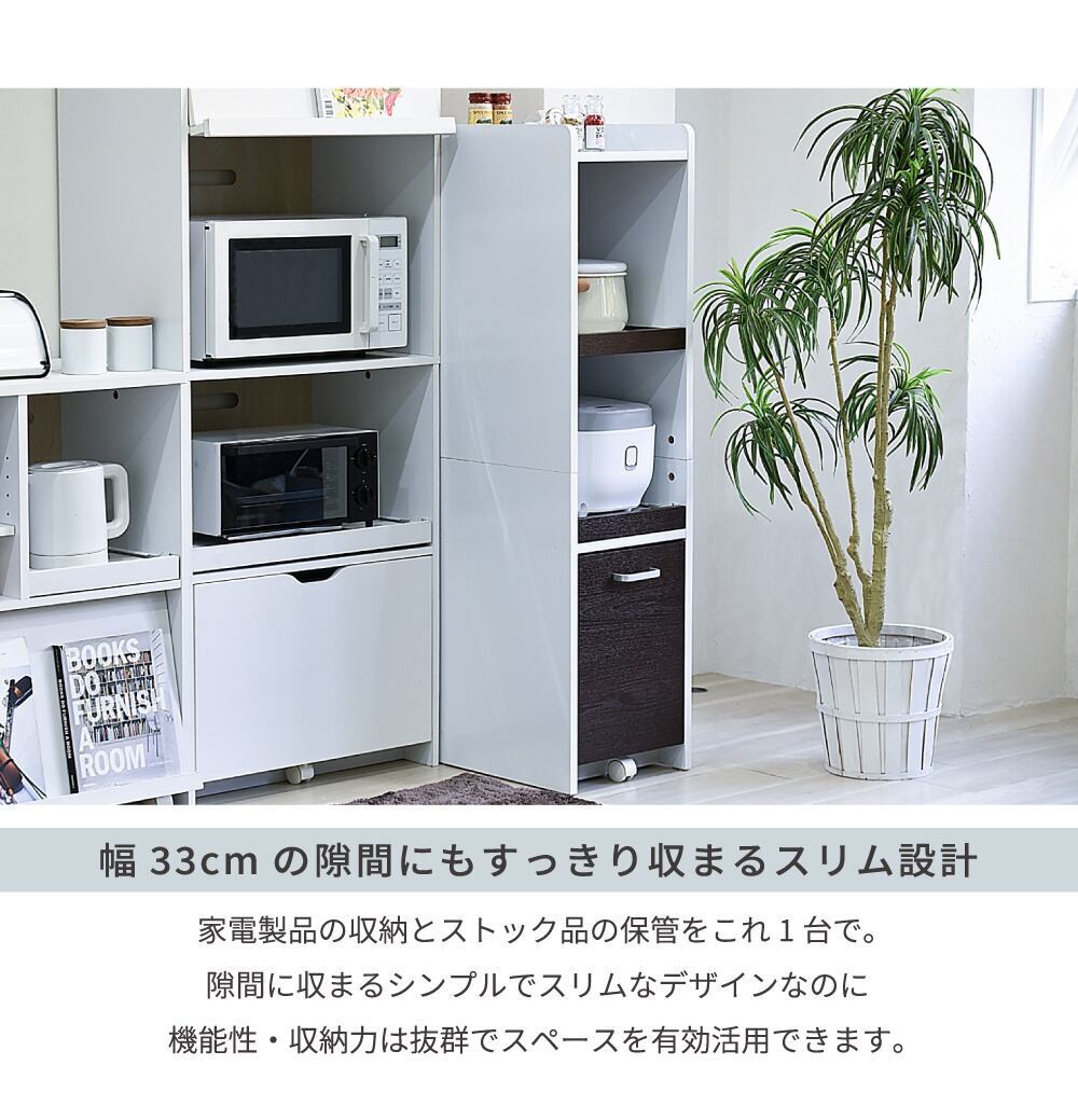 幅33cm、高さ120cmの省スペース設計で、狭い場所にもピッタリ収まります。スリムなフォルムとシンプルなデザインが、さまざまなキッチンスタイルに調和し、洗練された雰囲気を演出します。