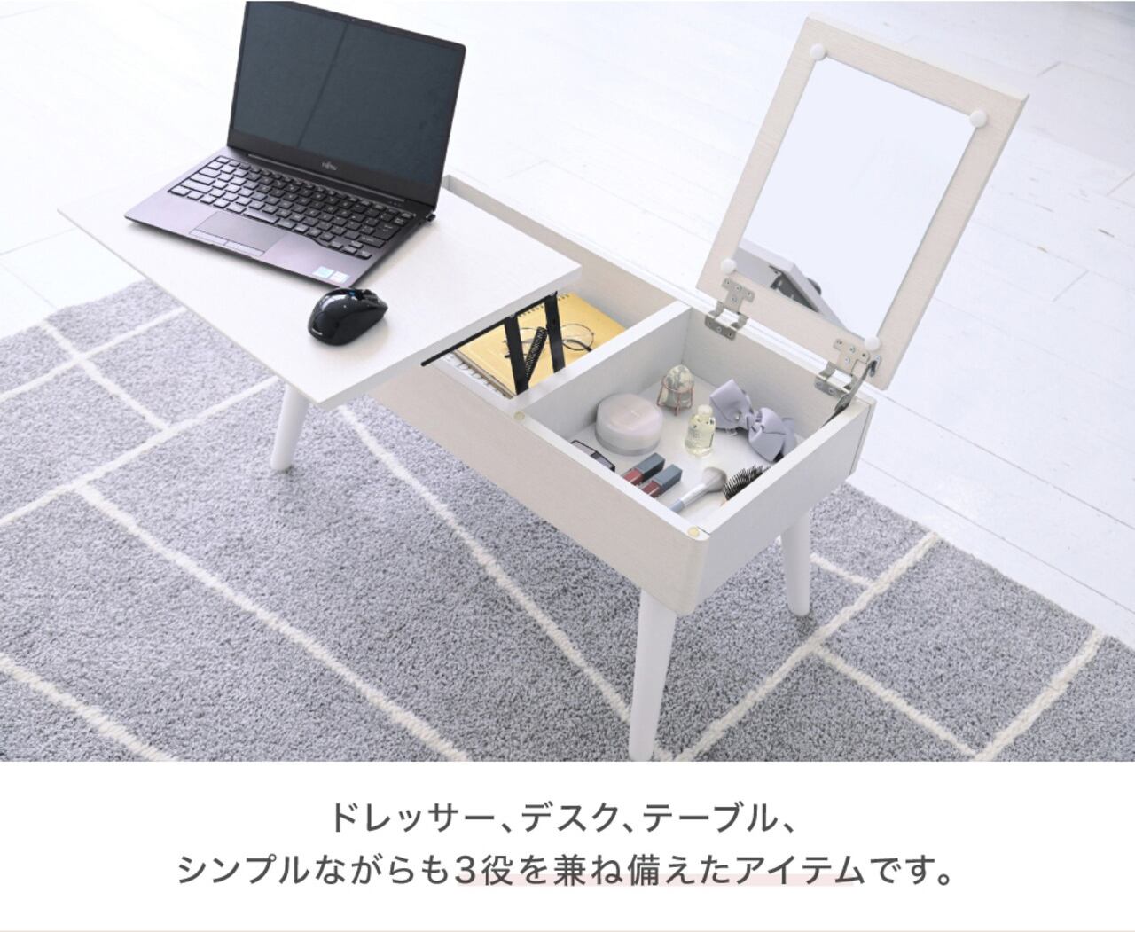 収納スペースが豊富で、ドレッサーとして化粧品や小物をすっきり整理できます。昇降式の設計により、快適な高さで使用でき、使い方に合わせた柔軟なスタイルを実現します。組み立てが簡単なため、すぐにご利用いただけるのも大きなポイントです。