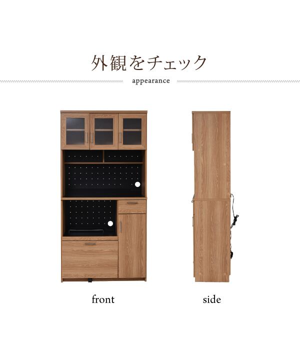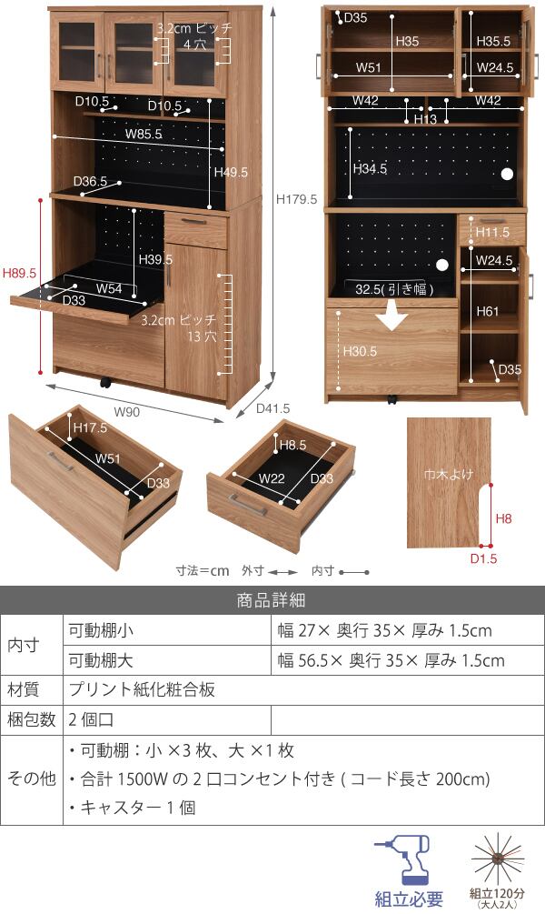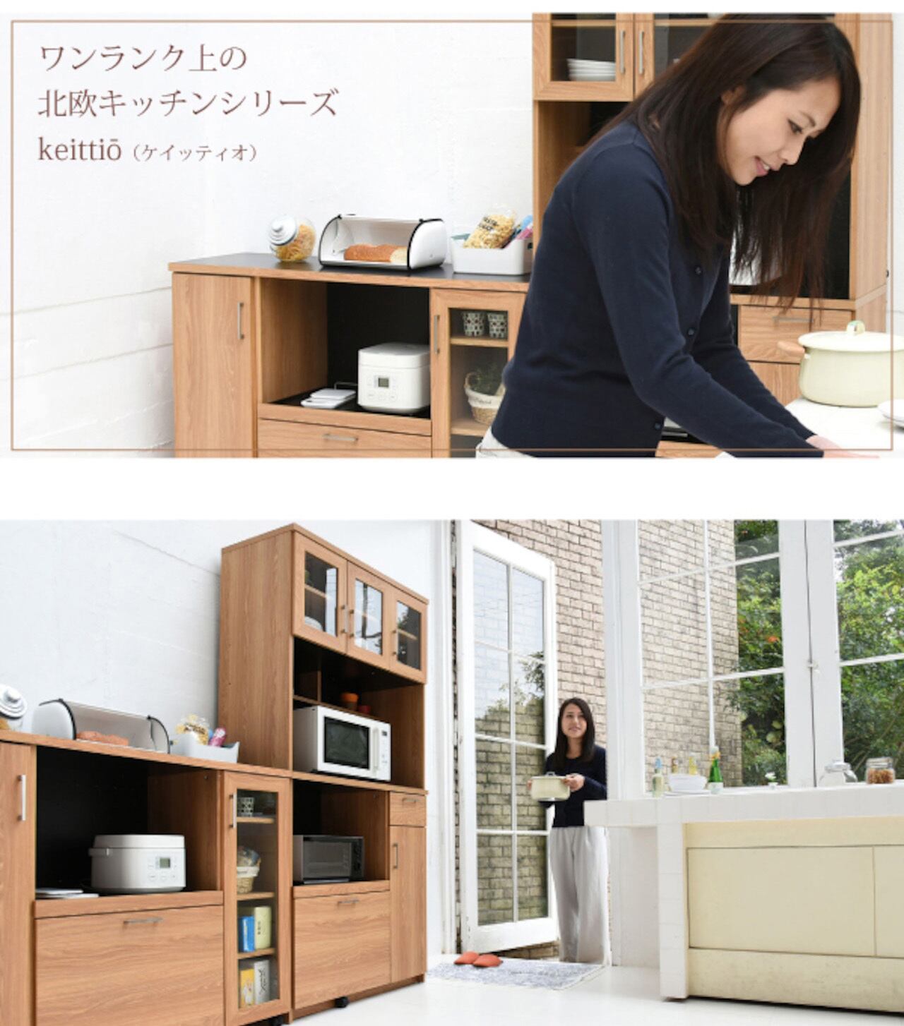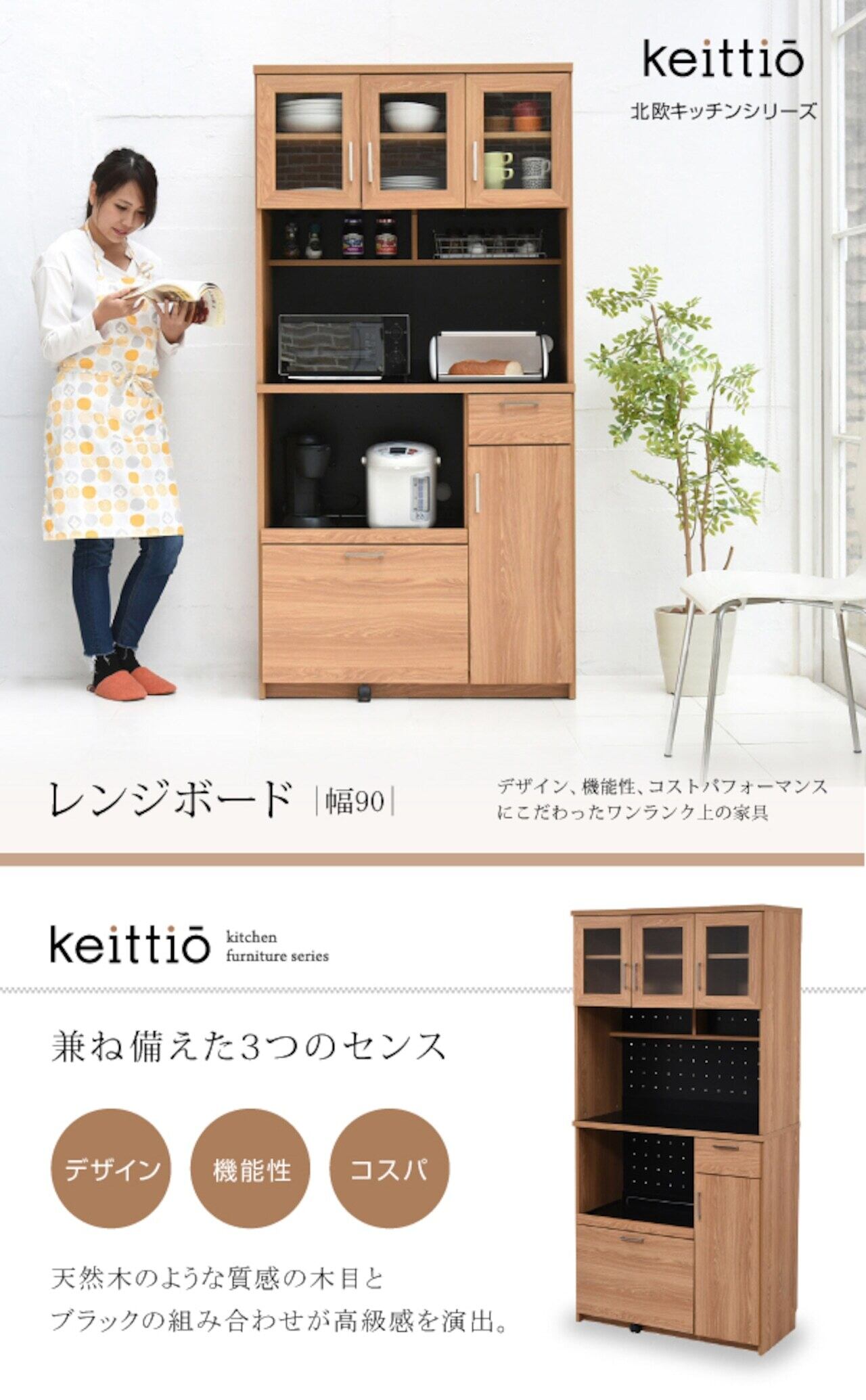 「大型レンジ台 レンジラック(北欧デザイン)」は、スタイリッシュなキッチン収納の決定版です!幅90cmというサイズは、使い勝手が良く、限られたスペースにもフィットするデザインが魅力です。スライド棚付きなので、調理家電や食器を効率よく収納でき、キッチンをすっきりと整頓することができます。また、ガラス扉を採用しているため、収納したものが見えるのも便利で、デザイン性にも優れています。合成樹脂化粧合板を使用しているため、お手入れも簡単で、長く美しい状態をキープできます。組立式で、手軽に設置ができるので、時間をかけずに快適なキッチン空間を享受できます。おしゃれで機能的なこのレンジ台で、日々の料理をさらに楽しくしませんか!