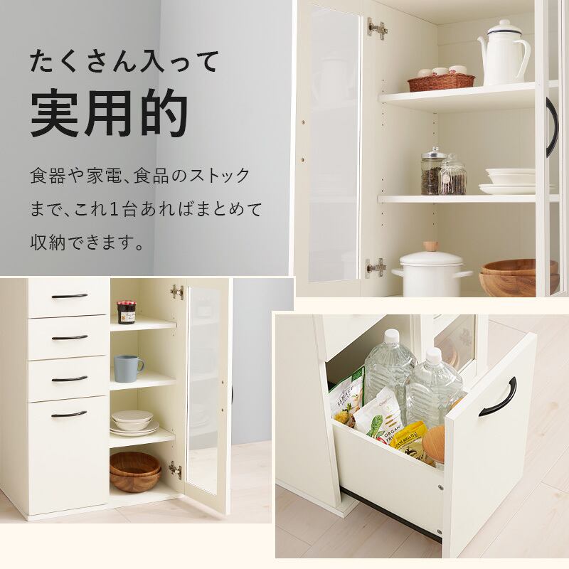 このキャビネットは、収納スペースを有効活用できる設計が魅力です。調理器具や食材を整理整頓することで、清潔感のあるキッチンを実現します。使いやすい引き出しや棚が備わっており、物の出し入れもラクラクです!