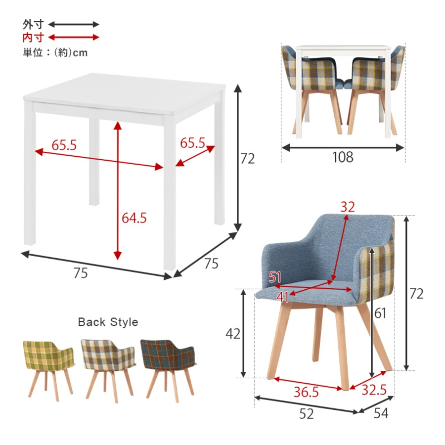 サイズ テーブル:(約)幅75×奥行75×高さ72cm、チェア:(約)幅52×奥行54×高さ72×座面高42cm