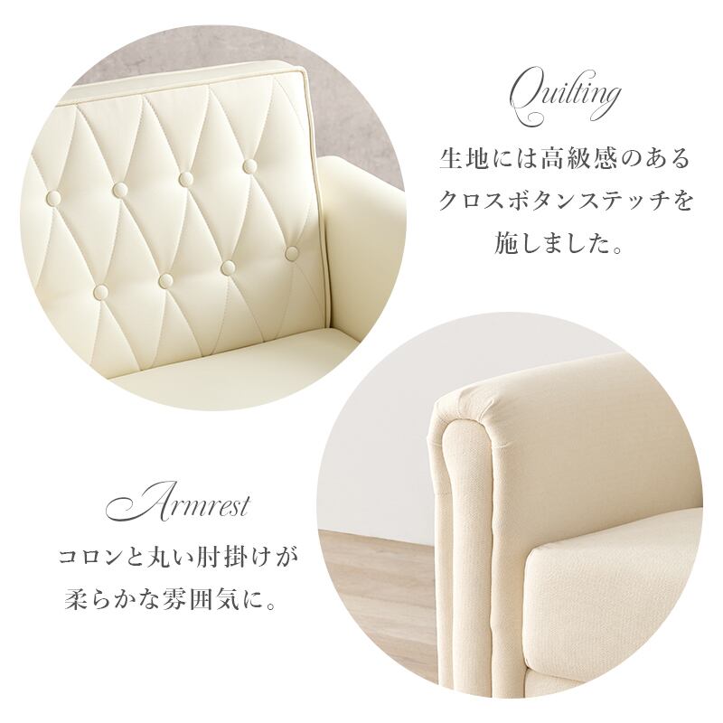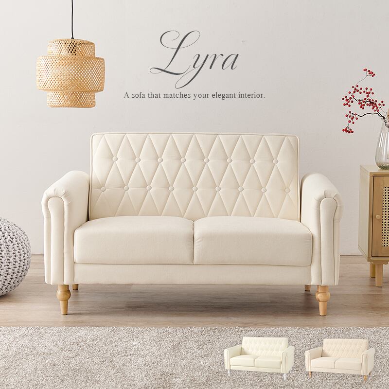 上品さと可愛らしさを兼ね備えた、2人掛けソファ ライラ2Pです!背面のクロスボタンステッチや丸い肘掛けが魅力的で、リビングに華やかさを添えます。このソファは居心地の良さを大切にしたデザインで、くつろぎの空間を演出。おしゃれなインテリアとして、友人とのおしゃべりや家族とのリラックスタイムをより特別なものにしてくれます。