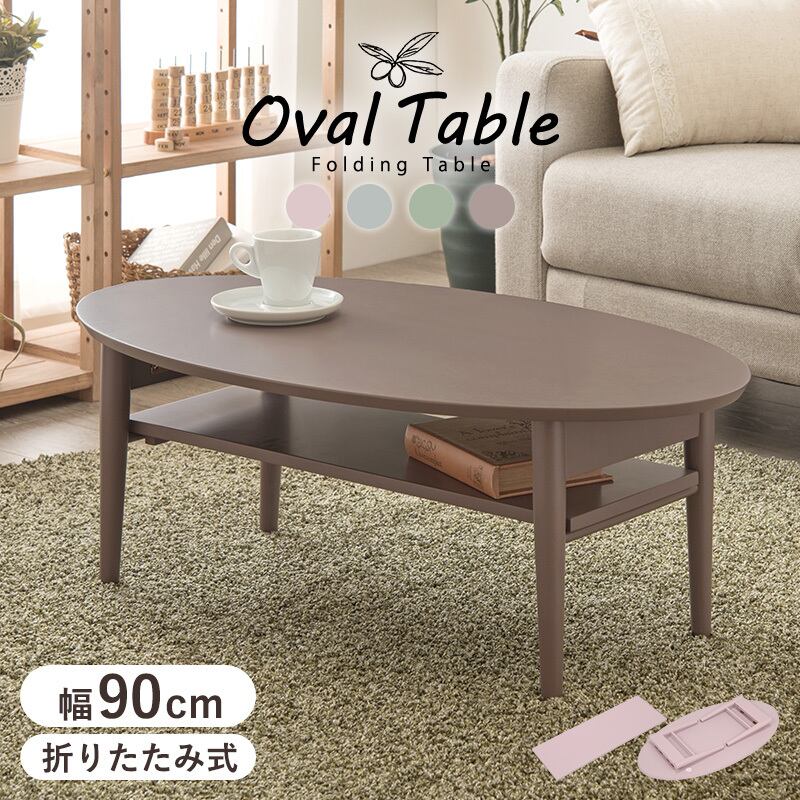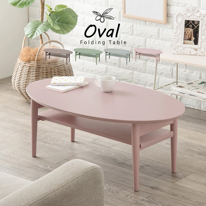 くすみカラーが可愛い折れ脚テーブル VT-7969です!角のないオーバルタイプは、柔らかな印象を与え、リビングやダイニングなどでの使用にぴったりです。収納棚が付いているので、雑誌やリモコンなどの小物をサッと収納でき、すっきりとした空間を作ります。使わないときは折りたたんでコンパクトに収納できるので、スペースを有効活用できるのも嬉しいポイントです。おしゃれで機能的なテーブルは、友人や家族との団らんの時間をより一層特別なものにしてくれることでしょう。