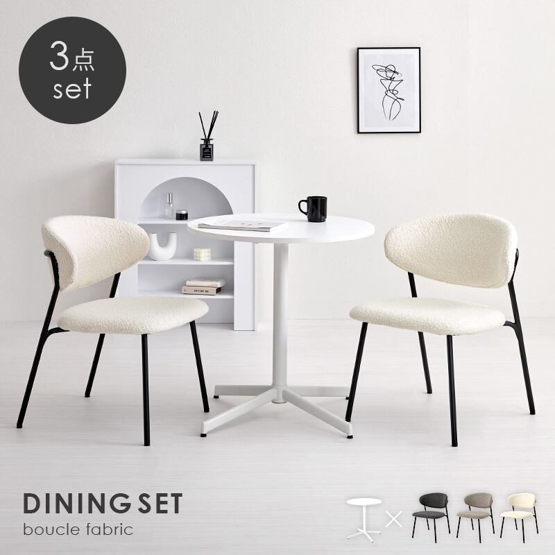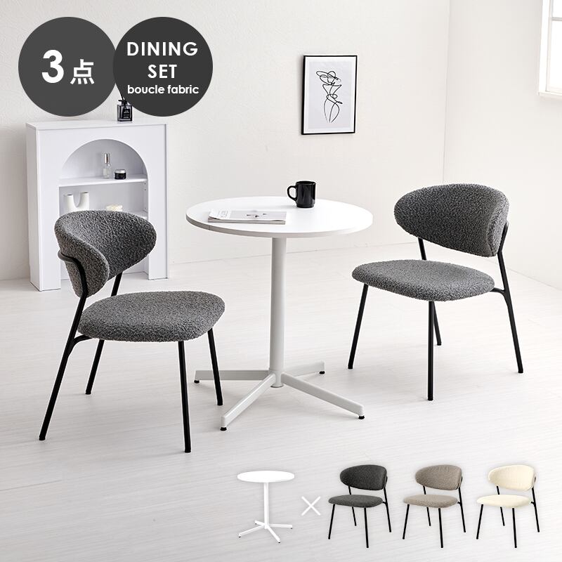 ぽこぽことした質感が特徴的なブークレ生地のチェアとホワイトカフェテーブルを合わせた、モダンでありながら温かみのある雰囲気の3点セット。