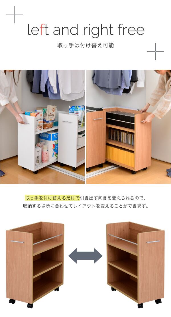 このスライド収納ラックの大きな魅力は、シンプルでありながら存在感のあるデザインです。大容量のスペースを持ちながらも、スリムなフォルムはお部屋の圧迫感を感じさせず、スッキリと整理整頓された雰囲気を演出します。リビング、クローゼット、キッチンなど、あらゆる空間に馴染むスタイリッシュなアイテムです。