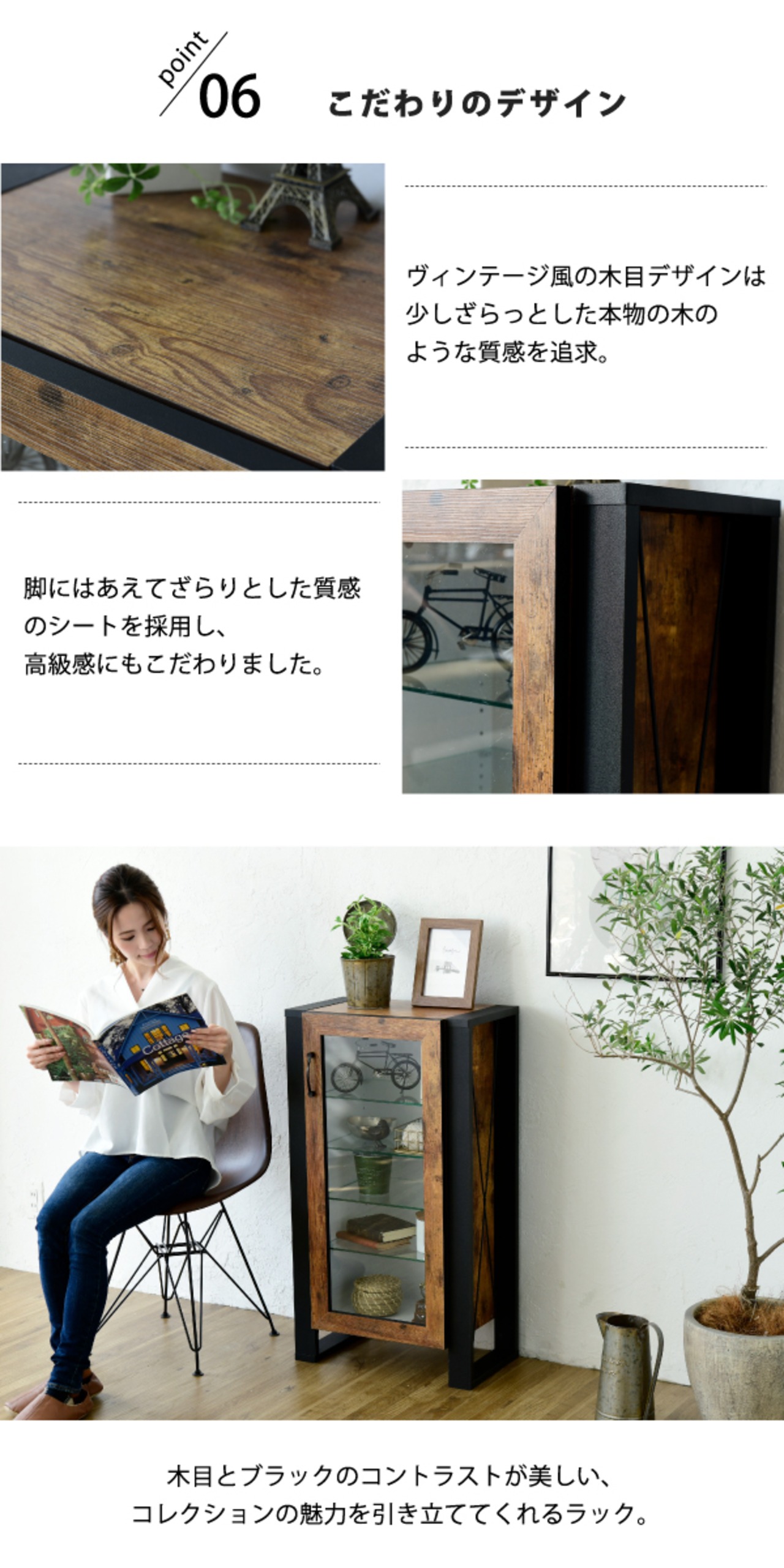 おしゃれなカフェの雰囲気を演出できる、ヴィンテージ風シートがクールなブルックリンスタイルのコレクションラック。無骨すぎないデザインで男女問わずご使用いただけます。ガラス扉&ガラス可動棚で「見せる収納」が実現できます。お気に入りの雑貨やフィギュアなどはここにディスプレイするのがおすすめです。