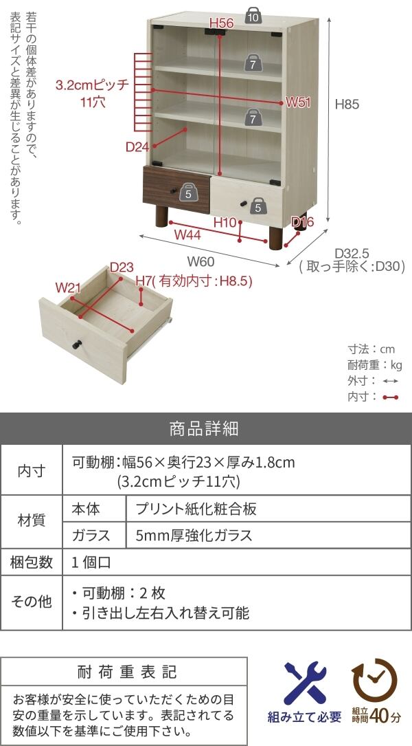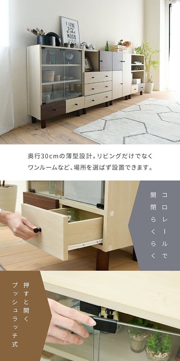 木目のあるナチュラル×ダークブラウンのツートーンで、ちょっぴりレトロな大人可愛いガラス扉×チェスト。ガラス扉にはお気に入りの小物や雑誌などを並べれば「見せる収納」として楽しめます。中は可動棚なので収納物に合わせて高さを調節できます。こまごましたものは引き出しに入れて見た目スッキリ!同じシリーズ商品と組み合わせることで、お部屋に合わせたレイアウトとオリジナル収納を実現できます。