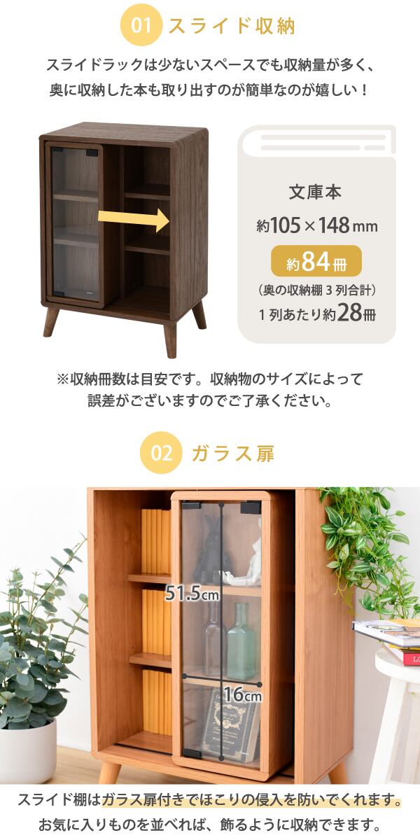 収納するものから設計されたデザインだから、コンパクトでも機能的。奥に収納したものもさっと取り出せる便利なスライドタイプの収納ラック。奥は本や参考書などに、手前のガラス扉収納はお気に入りの小物や写真などの収納に。丸みのある北欧風のデザインはとてもおしゃれで、ひとり暮らしのお部屋にもぴったりです。