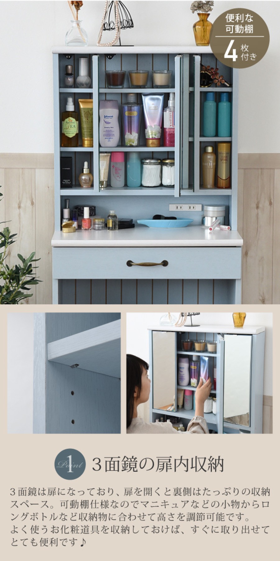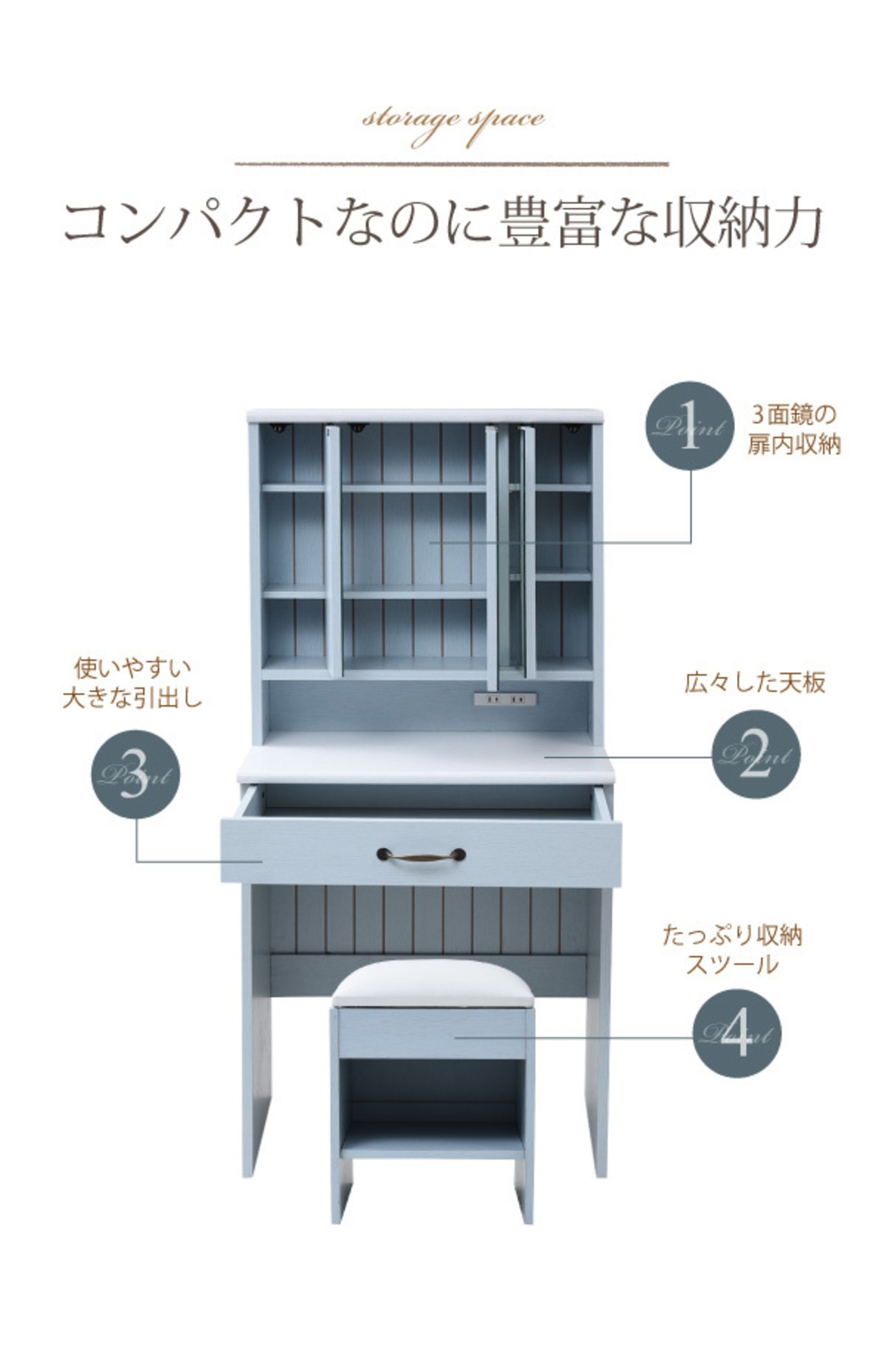 コンパクトながら収納力抜群の三面鏡ドレッサー&スツールセットです。