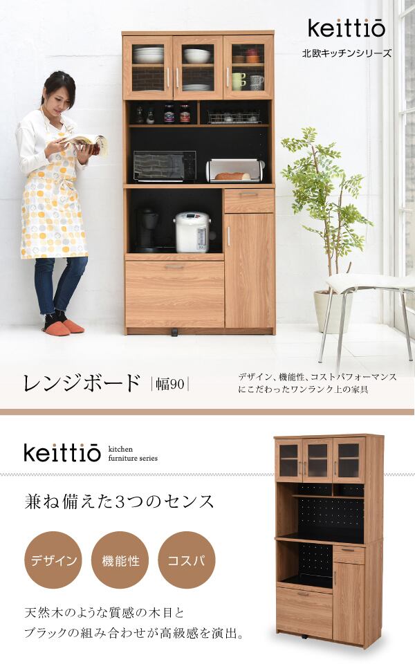 置くものを選ばない食器戸棚付きレンジ収納ラック。これ一台でおしゃれな北欧キッチンに早変わり! キッチン家電 食器 すべてが収まります。デザイン性、機能性、収納力に富んだ実力派のレンジ台。