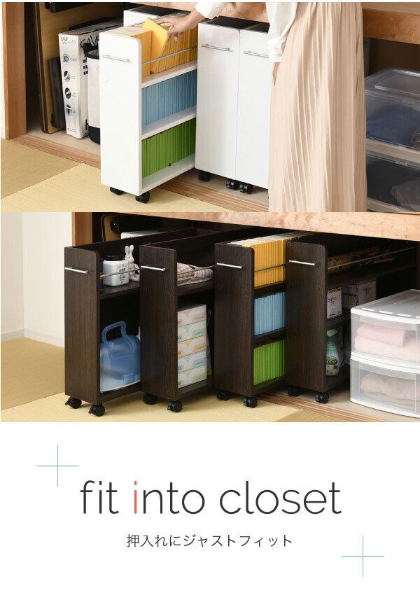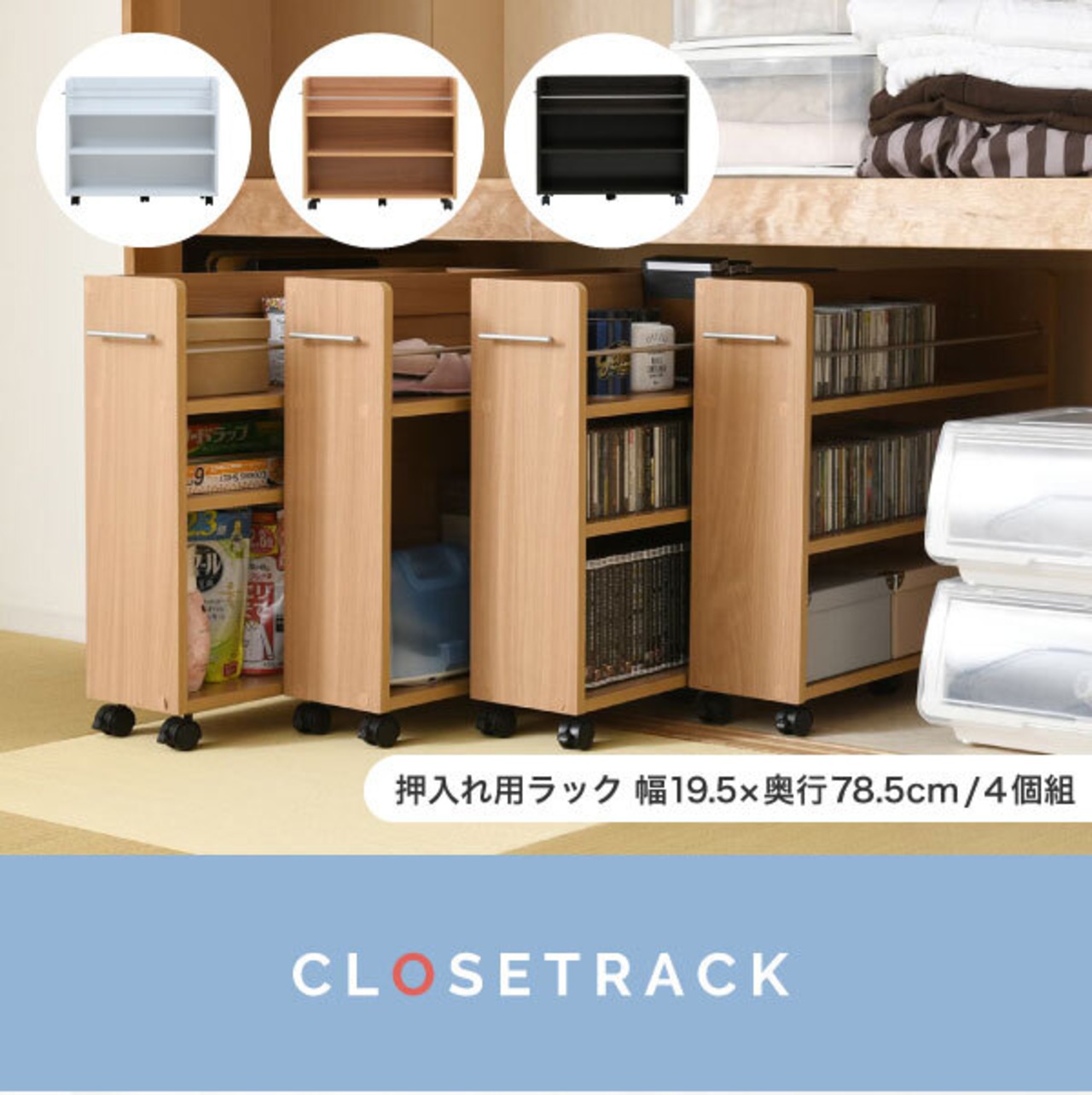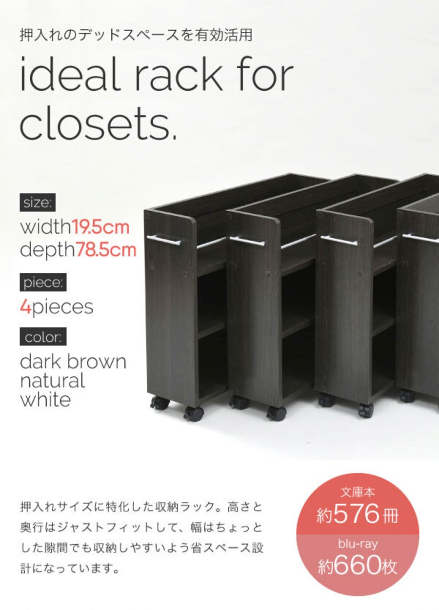キャスター付き 収納 押入れ ラック 本棚4個セットが新登場!幅19.5cm、奥行78.5cmのスリムなデザインは、狭い隙間を有効活用し、部屋をすっきりと整理整頓するサポートをします。移動が簡単なキャスター付きなので、気軽にレイアウトを変更できます。